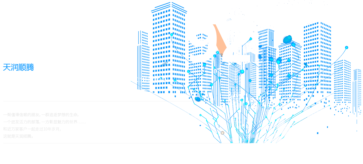 一幫值得信賴的朋友,一群追逐夢(mèng)想的生命, 一個(gè)迸發(fā)活力的部落,一方彰顯魅力的世界…… 和近萬家客戶一起走過10年歲月, 這就是天潤(rùn)順騰。